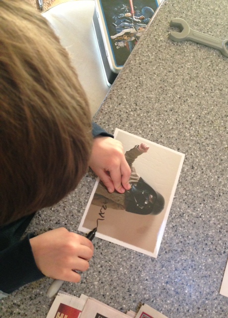 If you would like to choose a theme it will add to the card. We chose Star Wars, of course. Print the pictures in 5×7 landscape style. Print as many pictures as you need cards. Yay! That was cheap and easy.