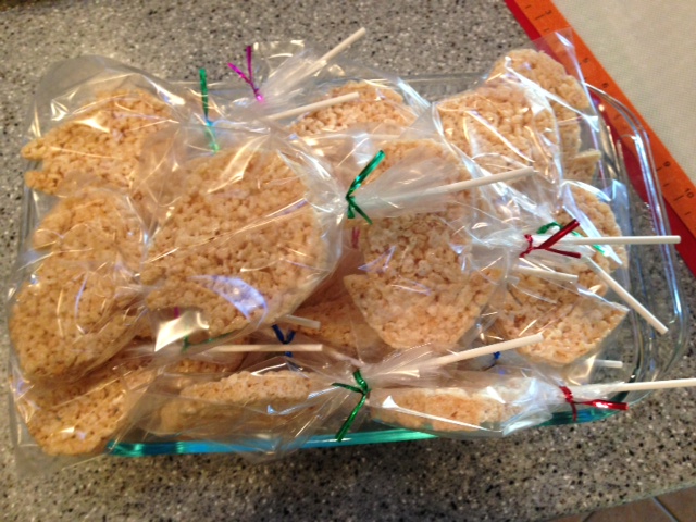 Step 4 – Make the Rice Crispy Treats and let cool completely in the pan. Butter the cookie cutters and cut out the shapes. We used our Millennium Falcon and X-wing Fighter cookie cutters. Let the shapes cool in the refrigerator for 15 minutes. Next, melt one marshmallow, place the tip of a stick into the melted marshmallow, then immediately insert the sticky tip into the Treat, and repeat. Once all the Treats have their sticks firmly in place, individually put them in a bag and twist tie it closed. Don’t forget to eat the leftover pieces!