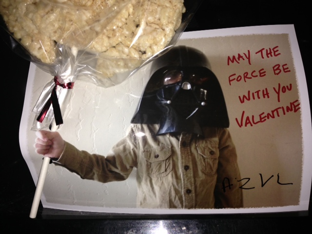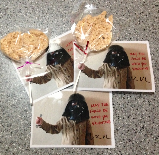 Step 5 – Finish the cards! Slide the stick from the Treat through the holes in the card, in the top hole and out the bottom hole and you have the Best Kids Valentine’s Day Cards Ever! May the Force be with you!