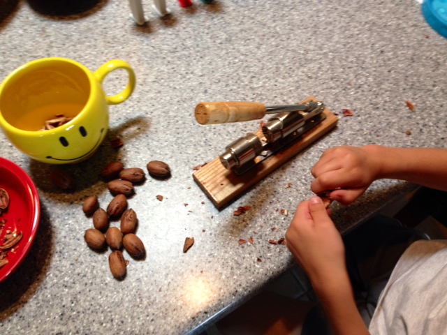 Step 1 – Shell the nuts (if your nuts are shelled skip to Step 2) This took us about an hour and my little helper started strong, but after about ten minutes he said with a stretch of his arms, “Ahhh! I need to take a break.” And he moved from the kitchen counter to the couch. I continued cracking. I did hear a small voice proclaim, “Nothing’s better than sitting back and listening to nut cracks! How relaxing!” He did say, “nut cracks,” that was not a typo. If you can get your kids to stay longer, more power to you!