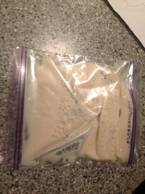 Mix ingredients (milk, vanilla and sugar) in a small bag. Remove all the excess air and seal the bag tightly. Place the first bag in a second small bag removing all air and sealing tightly.