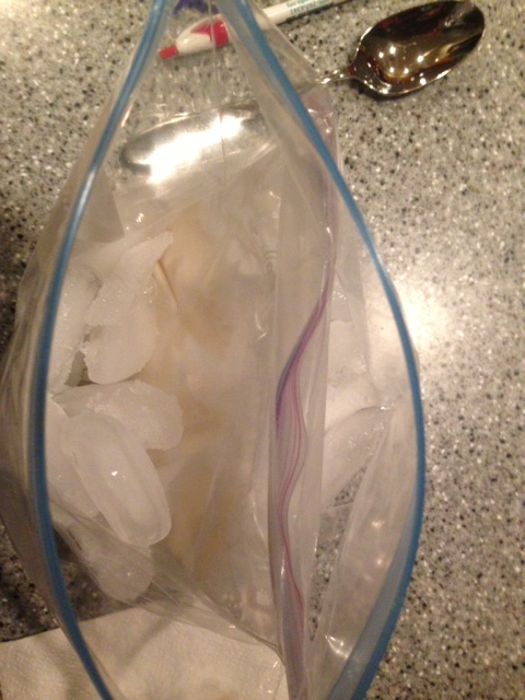 Place these bags into the large bag. Surround with ice and add salt. Remove air and seal well. Wrap in a towel and shake lightly and massage until solid, about 5 minutes.