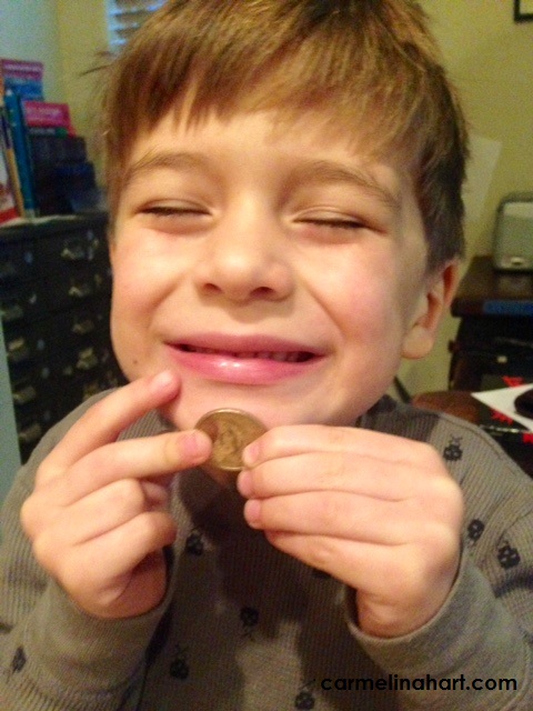 In the morning I woke to a happy toothless grin and a six year-old’s narrative of the events leading up to the discovery of the gold coin. I have definitely gained a reason to smile.