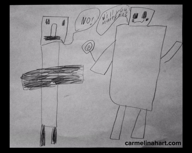If you are familiar with Minecraft, you know this is an Iron Golem proposing to a Villager, as seen through the eyes of a seven year-old.