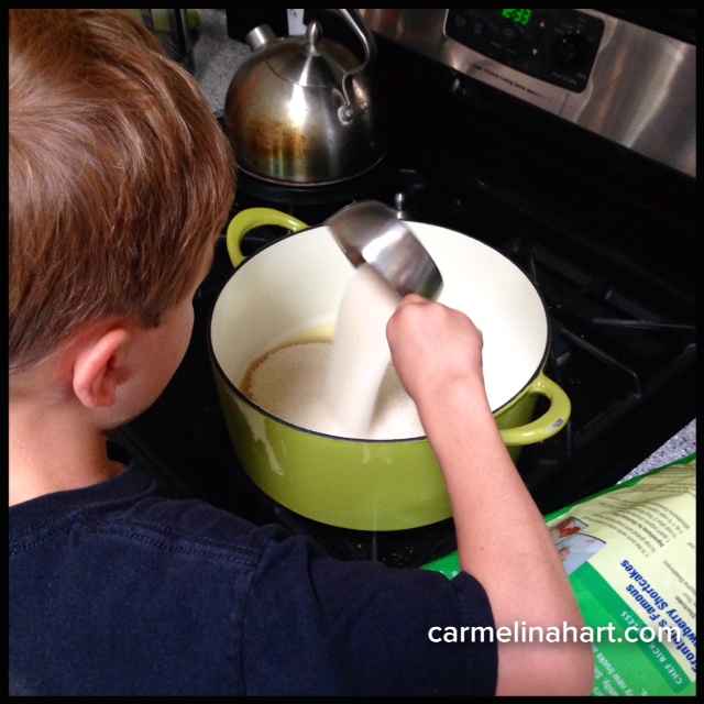 Step 4 – While you prep, your child can measure out the other ingredients and add them to the pot. Place the pot on the stove over low heat and add the peeled fruit. Cook on low heat and stir occasionally. Just remember low and slow, low and slow.