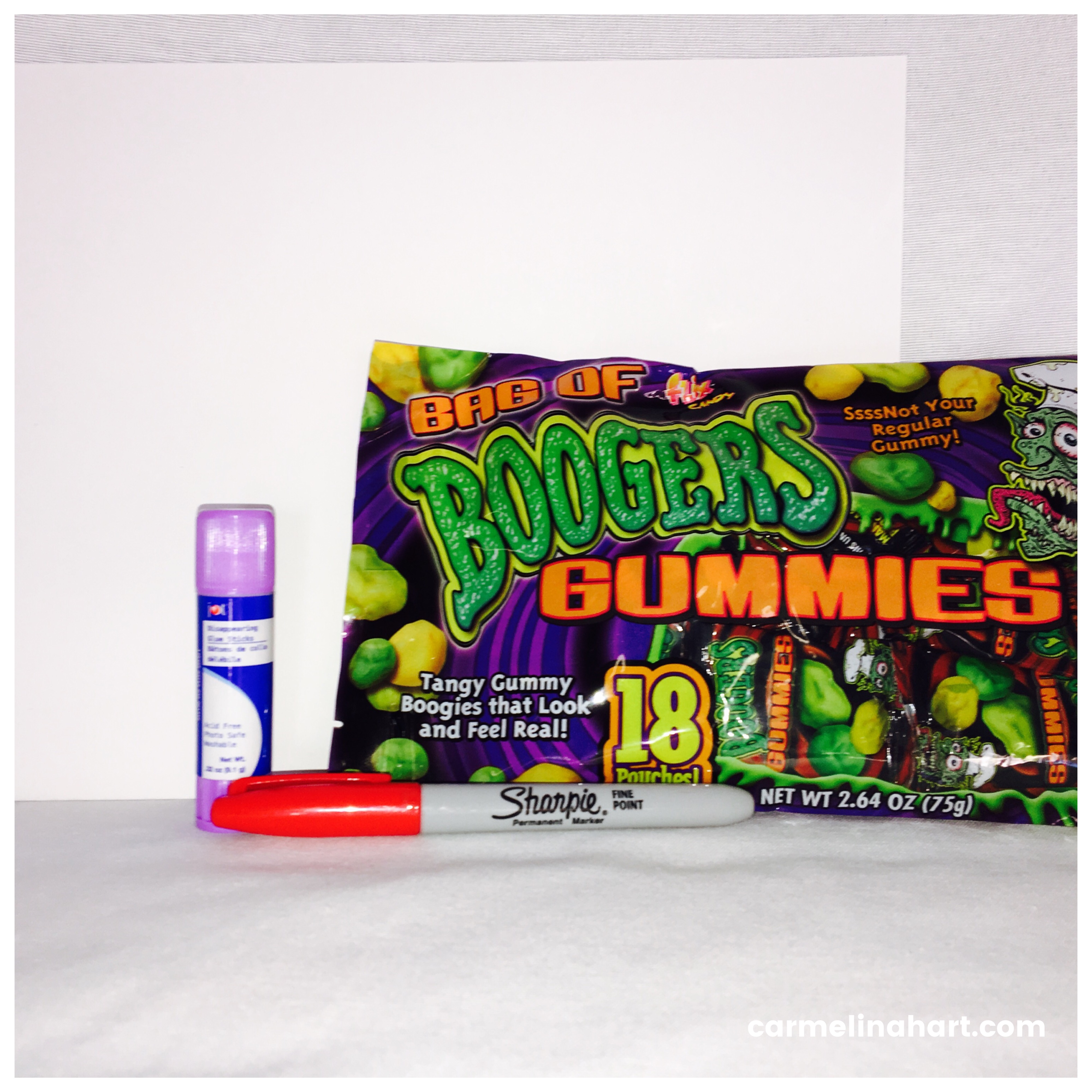 Step 5) Then he glued each small bag of gummy boogers to the tip of his finger on the card. I promise, it was glue!
