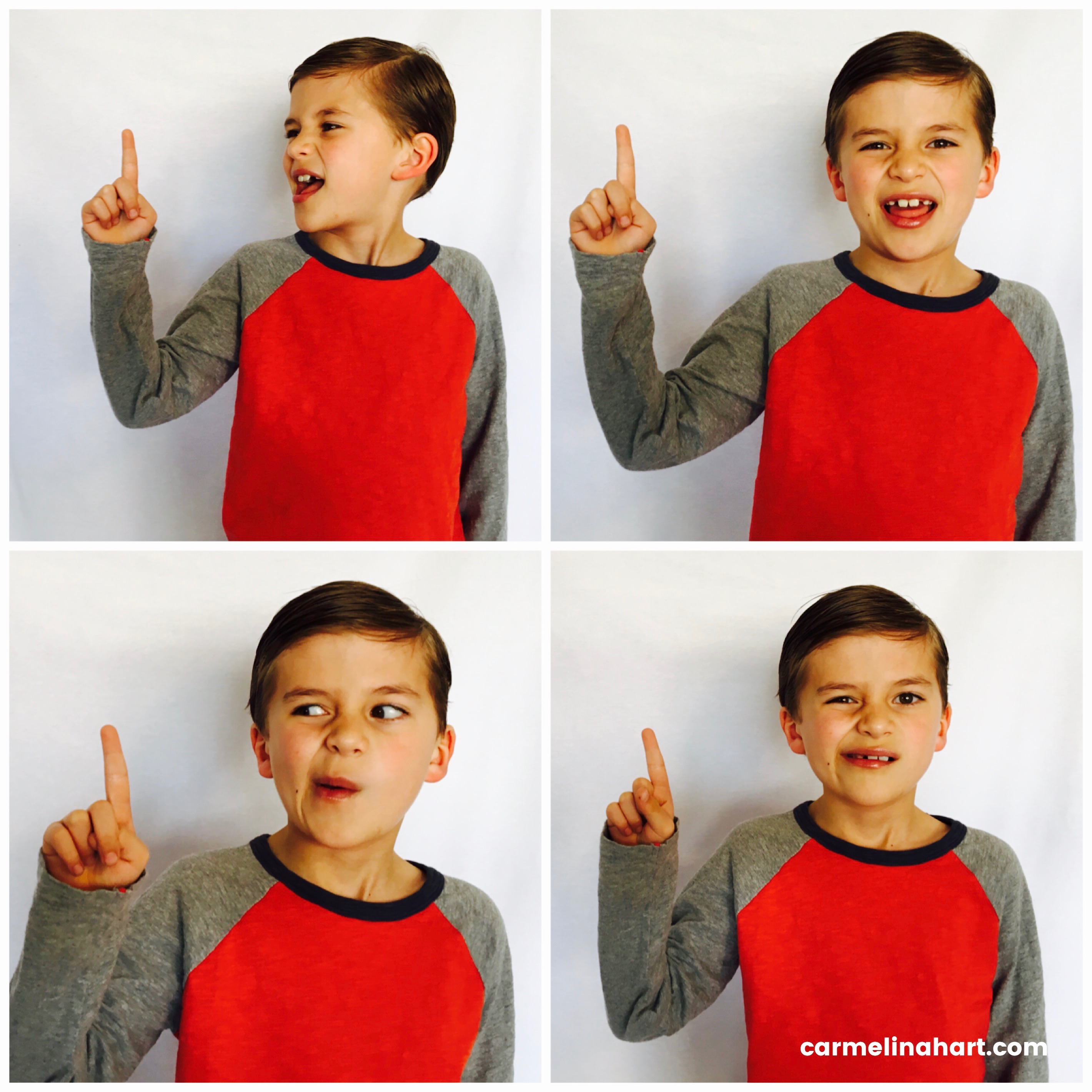 Step 1) We took a few pictures with different expressions, while he held his hand next to his shoulder and his index finger pointing up. And he picked the one he wanted to use.