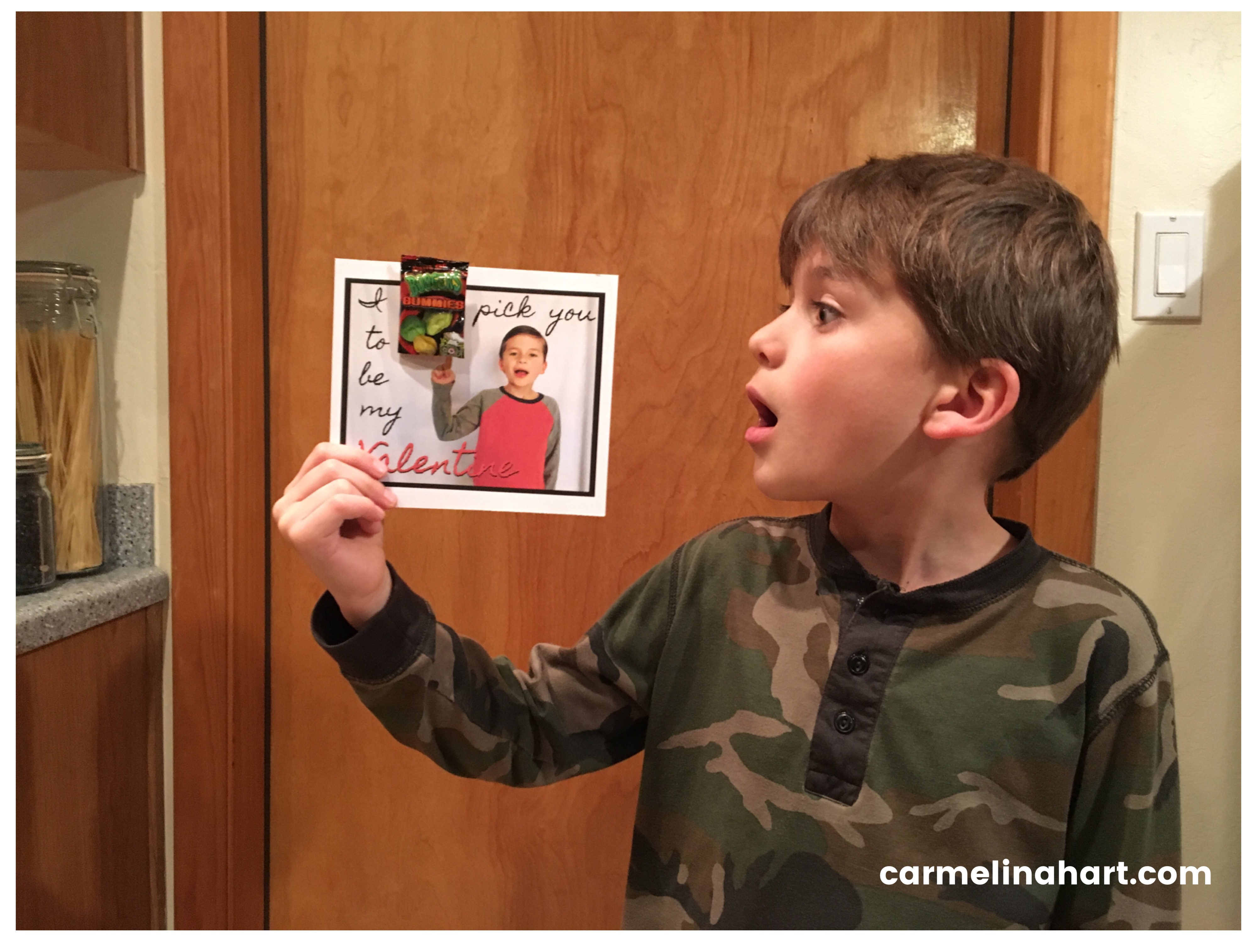 This year’s project took some convincing and a little begging, things were thrown around like, “It’s the second grade, it’s not that gross, it’s funny, it’s just a play on words, come on, laugh, there’s candy” and then finally, “you won’t get an infraction, but if you do, I’ll tell the teacher it was my idea.” I used everything I had and succeeded, my eight year-old finally broke and we made the cards I wanted …